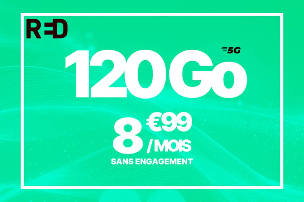 RED by SFR met actuellement en avant un forfait 5G à 8,99 euros par mois, incluant 120 Go de données en France et 30 Go supplémentaires utilisables depuis l’Europe et les DOM. Une formule bien pensée, qui combine confort d’utilisation, data généreuse à l’étranger et le tout sans engagement.