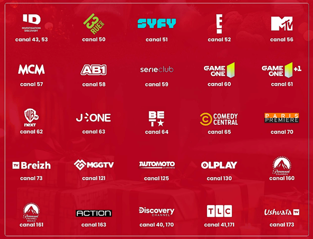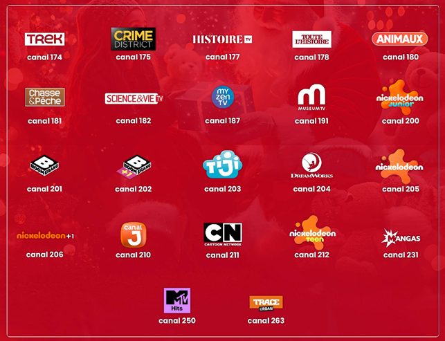 Le Bouquet Famille, habituellement payant, comprend des chaînes variées pour tous les publics. Les amateurs de séries et de divertissement y trouveront notamment Serieclub, 13ème RUE et Paris Première. Pour le jeune public, des chaînes comme DreamWorks et Boomerang sont incluses. Les passionnés de documentaires pourront quant à eux visionner des programmes sur Discovery Channel et Ushuaïa TV.